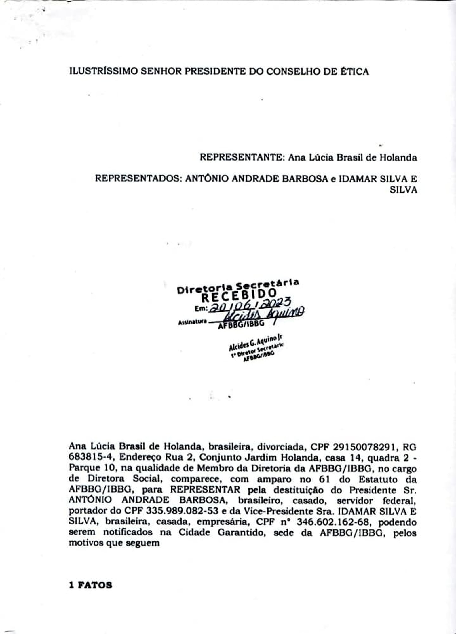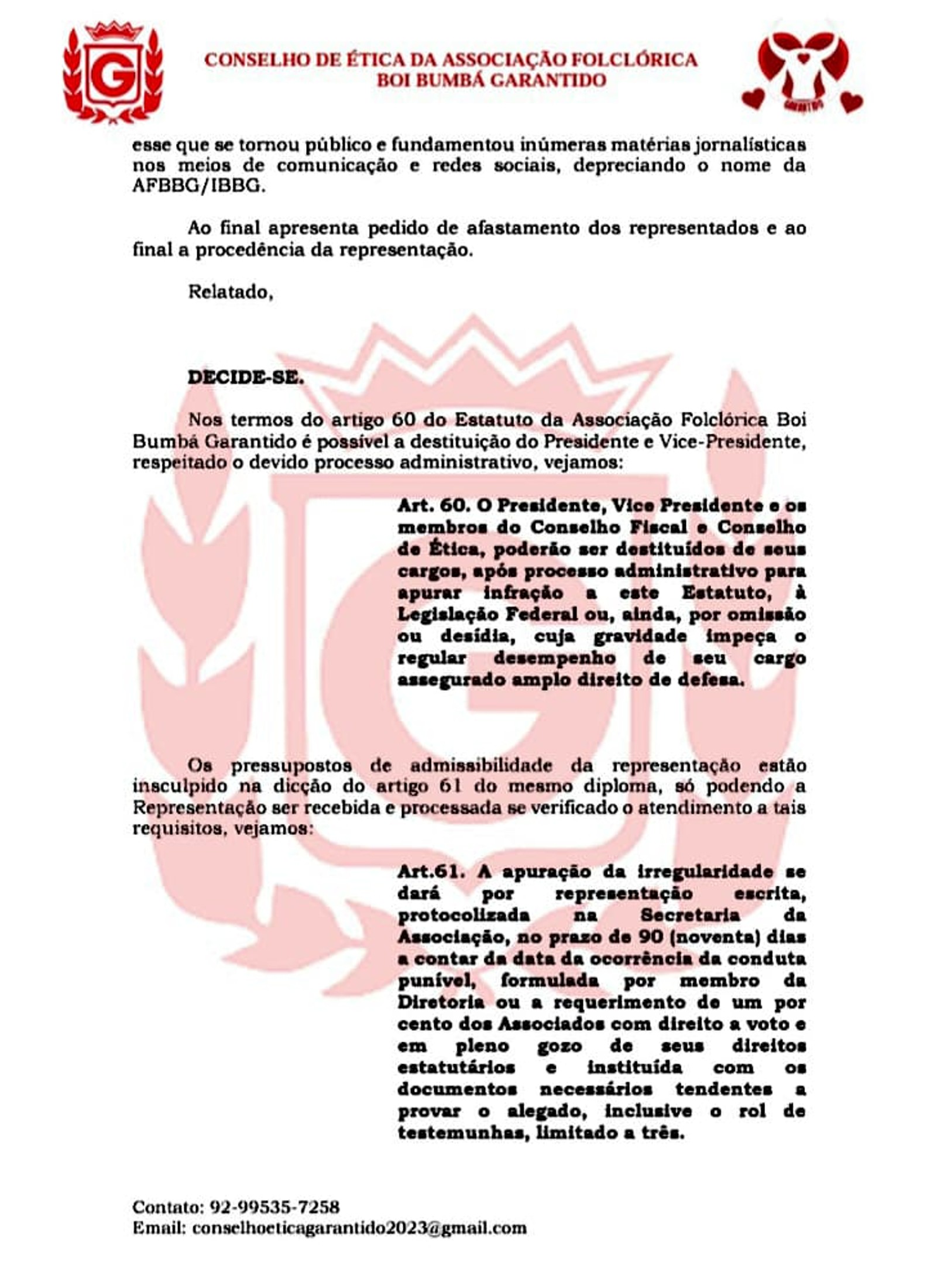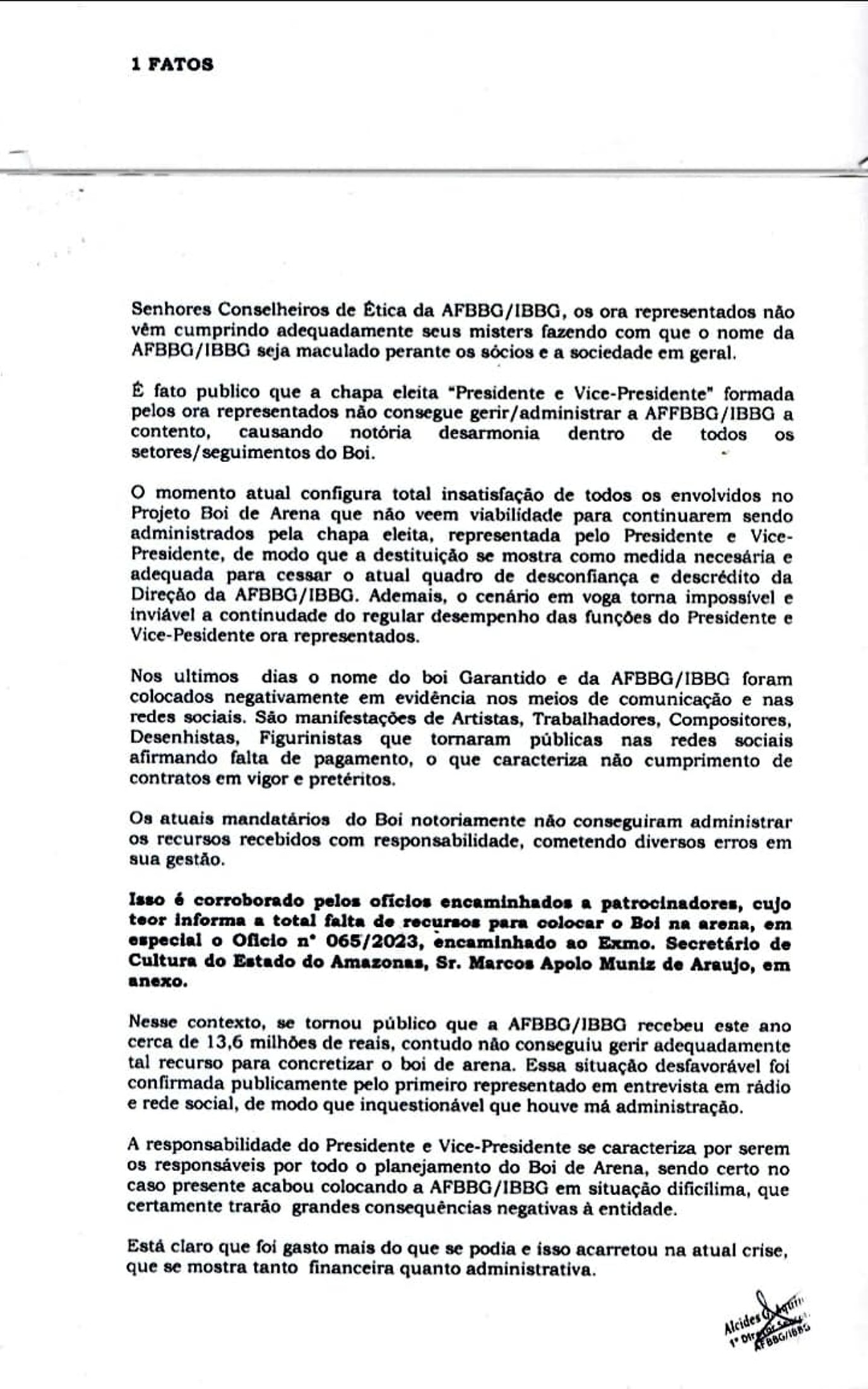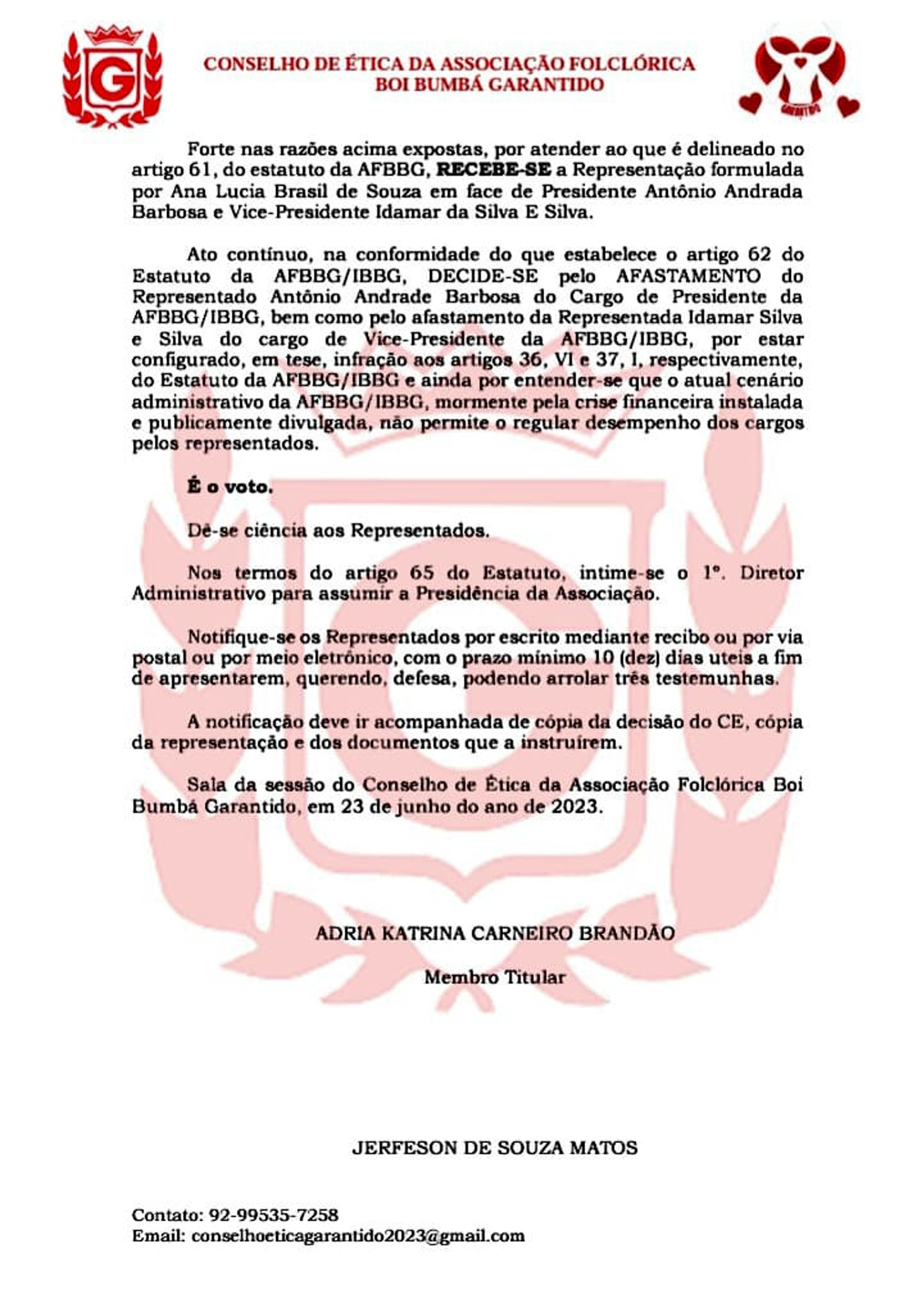O Conselho de Ética da Associação Folclórica Boi-Bumbá Garantido publicou a representação de afastamento do presidente Antônio Andrade Barbosa e da Vice Idamar Silva Silva. O documento teve como autora Ana Lúcia Brasil de Holanda, membro da diretoria do Boi Garantido e que foi acatado pelo Conselho de Ética do Garantido, tendo como presidente Gerson Oliveira.