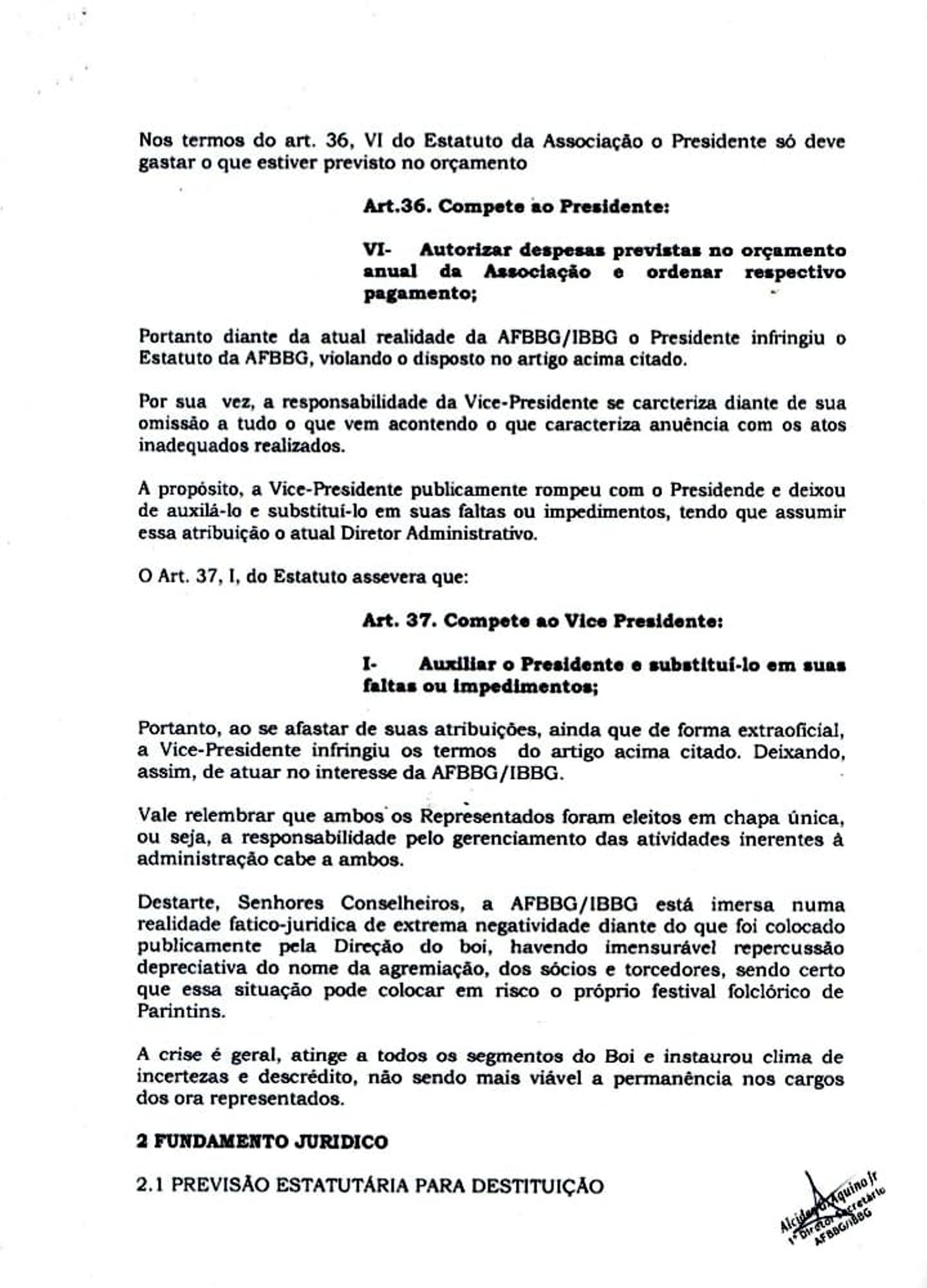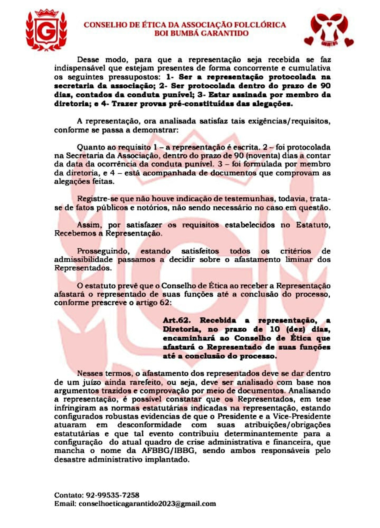 Após o recebimento da representação, o Conselho de Ética analisou o documento e decidiu pelo afastamento Antônio Andrade Barbosa e da Vice Idamar Silva, tendo como base o artigo 60 do Estatuto da Associação Folclórica.