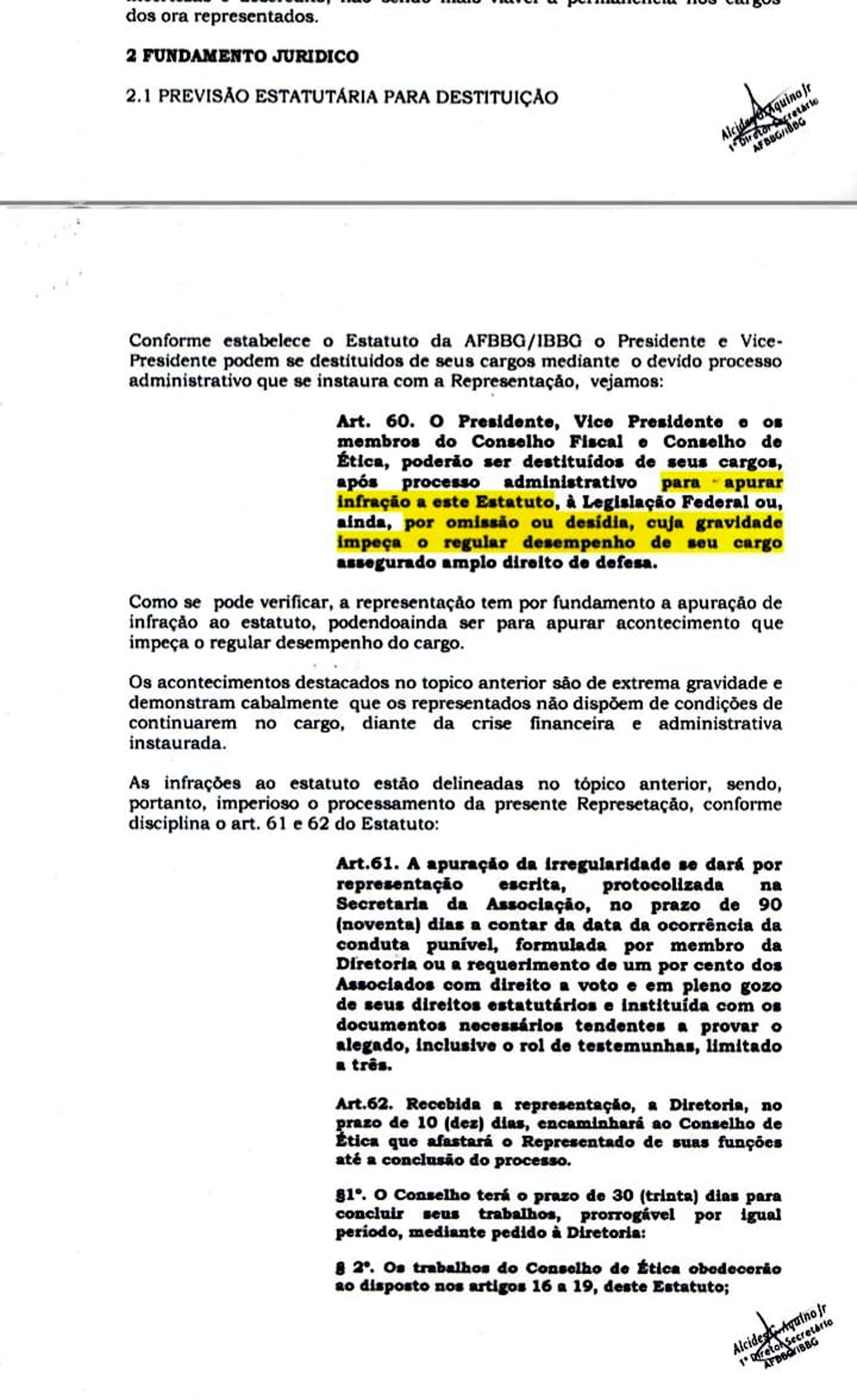 Artigo 60: “O Presidente, Vice-Presidente e os membros do Conselho Fiscal e Conselho de Ética, poderão ser destituído de seus cargos, após processo administrativo para apurar infração a este Estatuto, às Legislação Federal ou, ainda por omissão ou disídia, cuja gravidade impeça o regular desempenho de seu cargo assegurado amplo direito de defesa.