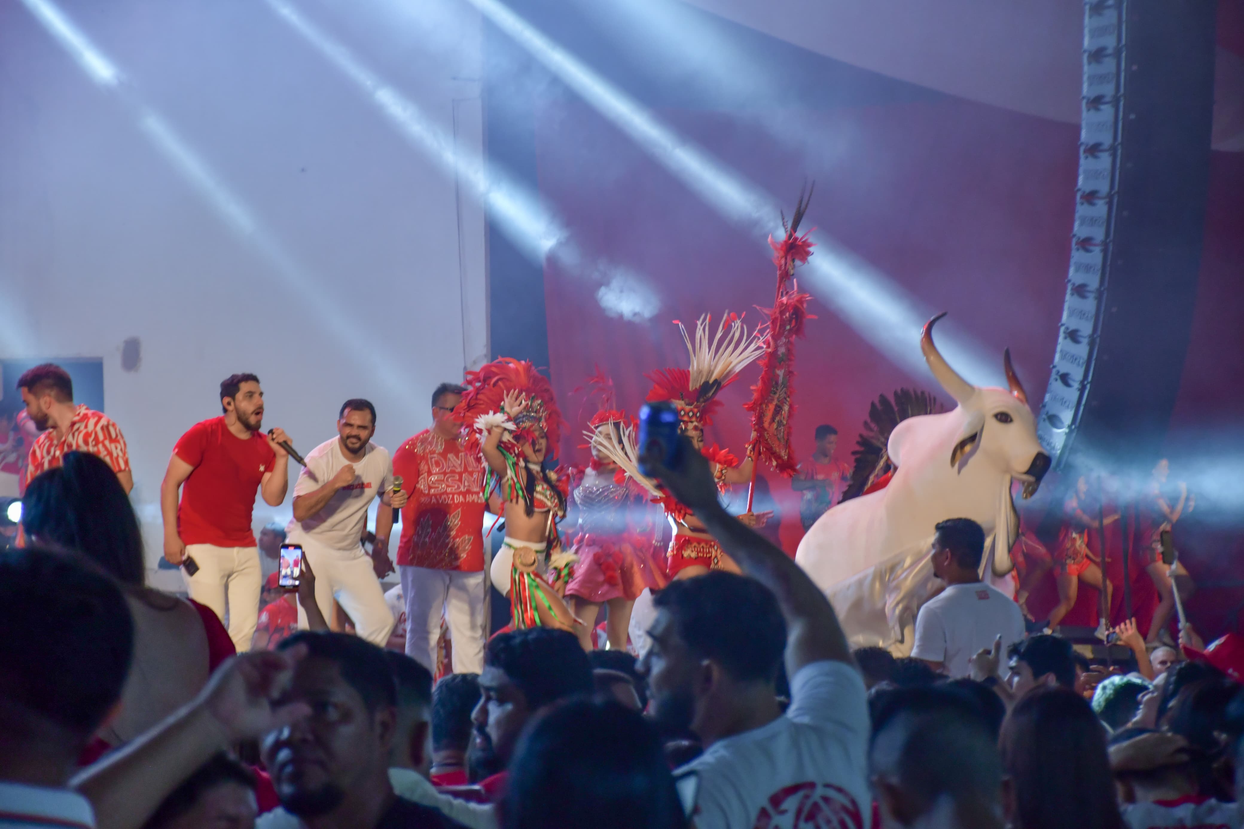 Um dos momentos mais empolgantes da noite foi a apresentação dos itens oficiais. Em revezamento e a cada toada específica, as musas encarnadas mostraram leveza e dança em suas performances: Edilene Tavares (rainha do folclore), Lívia Cristina (porta-estandarte) e Valentina Coimbra (sinhazinha da fazenda). O momento de ritual indígena foi um show à parte com a evolução de uma dança xamanistica do pajé Adriano Paketá.