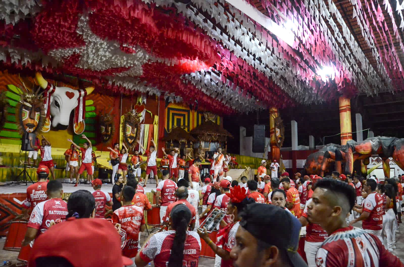 A nação vermelha e branca lotou o curral Lindolfo Monteverde para 'matar a saudade' de brincar de boi-bumbá no primeiro ensaio da Batucada do Boi Garantido para a temporada do Festival Folclórico de Parintins 2023, na noite de terça-feira, 4 de abril.
