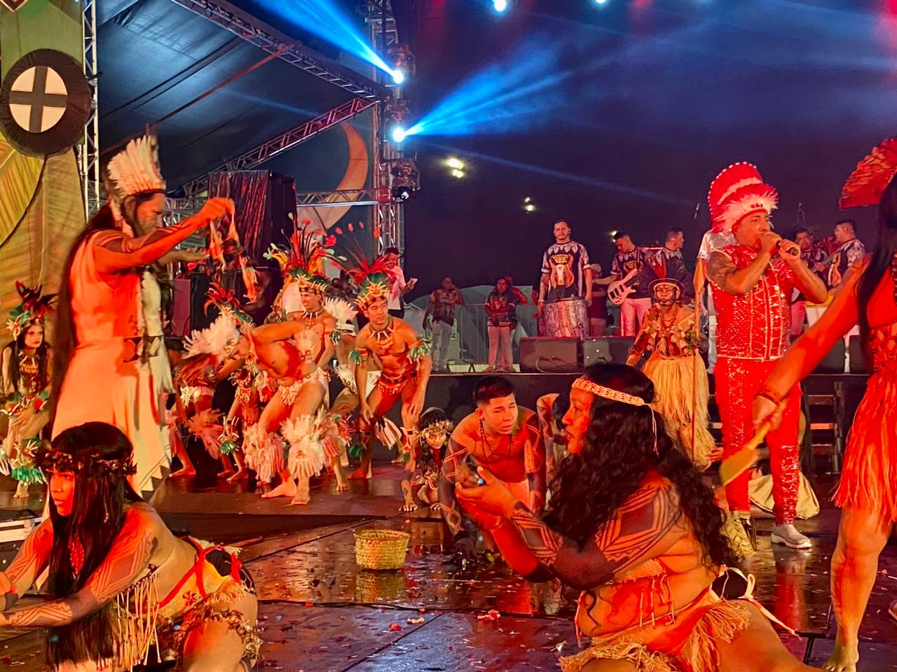 Em seguida o cacique Eliziário Kokama leu um texto em sua língua materna e todo o grupo cantou e dançou dividindo o palco com Carlinhos do Boi, o homenageado da noite. A toada “Lamento de Raça”, do poeta e compositor Émerson Maia, falecido em 2020, formou a trilha sonora deste momento tribal da noite.